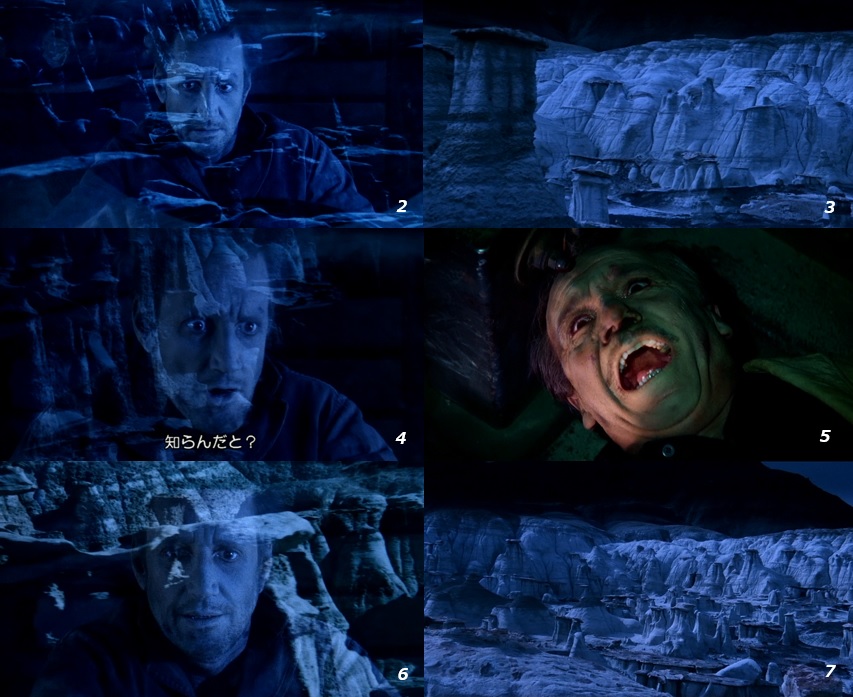 ▶ 南米ポルベニールのジャングルを困難の末、抜け出し、目的地の油田を近くにした山岳地帯を通行中にそれまでの出来事が悪夢のようにフラッシュバックしてドミンゲスを襲うのですが、その描き方がフリードキンらしい。( 2 ) でドミンゲスに山岳地帯の岩壁が重ね合わされ、( 3 ) でその岩壁がなぜか数秒映し出される。気付いた人もいるでしょうが、ここでフリードキンは岩壁の複雑な模様があたかも人の顔であるかのように匂わせ、不穏感を演出しているのですね。( 4 ) そして( 11~12 ) のドミンゲスの「 知らんだと? 」というセリフ。これはスキャンロンがアメリカから国外へ高飛びする為に会った仲介業者がスキャンロンがどの国へ連れていかれるのか知らないことに対するもの。それをあざ笑うかのように、先程、南米ゲリラに襲われて殺されたはずの相棒ニーロの高笑いの場面 ( 5 ) 。ちなみに、ドミンゲスというのはスキャンロンの南米での偽名 ( 違法入国なので )。