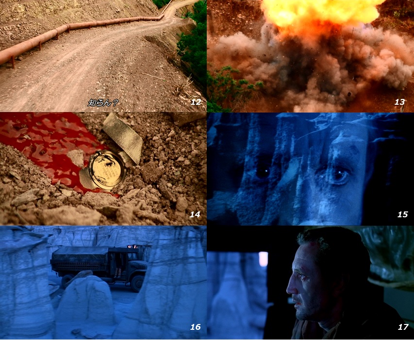 ▶ さて、ここまで見ると、このフラッシュバックはドミンゲスの個人的な経験の総体のように思えるかもしれません。しかし、以下のシークエンスでは事情が少し違うことが示されています。( 13~14 ) はセラーノとマルティネスの2人が運転するトラックが道を踏みはずし転落して爆発死するシーンなのですね。これはドミンゲスの経験ではないし、彼が知らないことでもあるのです ( 少なくともその時は )。もちろん、これはフリードキンのちょっとしたミスであり、ほとんどの人は気にかけないことでしょう。しかし、このような些細な事が哲学的考察のための契機でもあるのです。