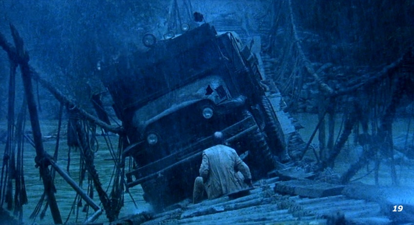 ▶ 通常であれば、観客は観念論的であるストーリーを理解する事によって作品にアプローチするのですが、フリードキンの『 恐怖の報酬 』は フリードキンの映像への拘りという唯物論的手法の方がこの作品を動かす要因になっている と言えるのです ( 実際にこの作品のストーリー自体は冒頭から分かりにくく、予備知識がないと4人の別々のエピソードが展開されている事に気付かないかも )。そのようなイマージュへのフリードキンの拘りが現れた有名なショットが豪雨の中で脆い吊橋を渡るトラックでしょう。