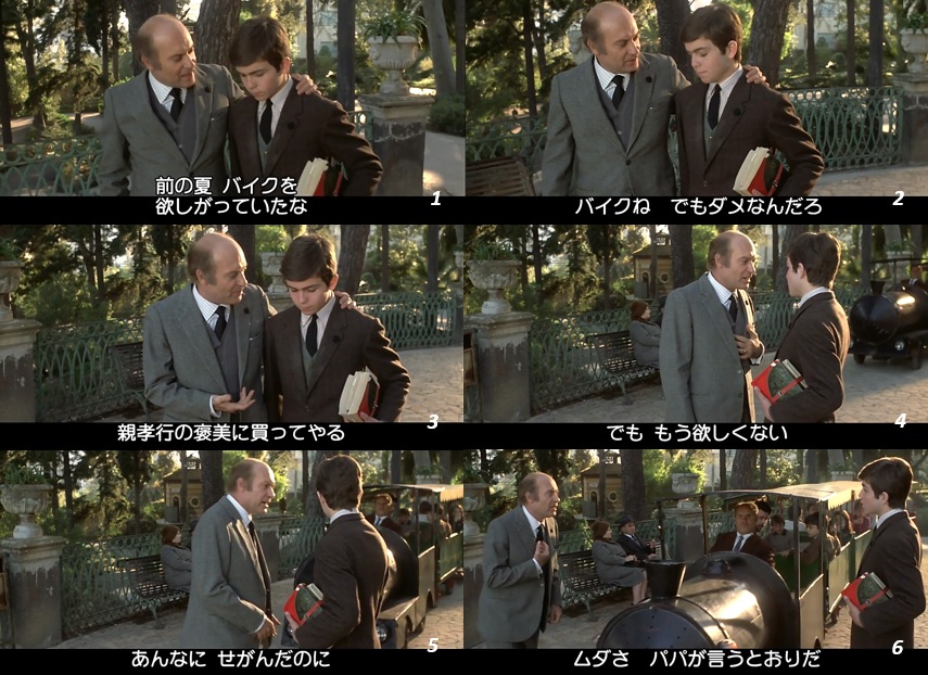 ▶ 以下はニーノが精神のダークサイドを露にしていく後半。 ニーノは、父親の再婚相手のアンジェラと結ばれたいという秘かな欲望、今では何よりも強い欲望、を父親に悟られまいとするが、以前は欲しがっていたはずのバイクはもう欲しくはない ( *2 ) と言って、それ以上の何か別の欲望を言外で仄めかしてしまい、父親に好きな女がいるのかと尋ねられる ( 1~6 )。