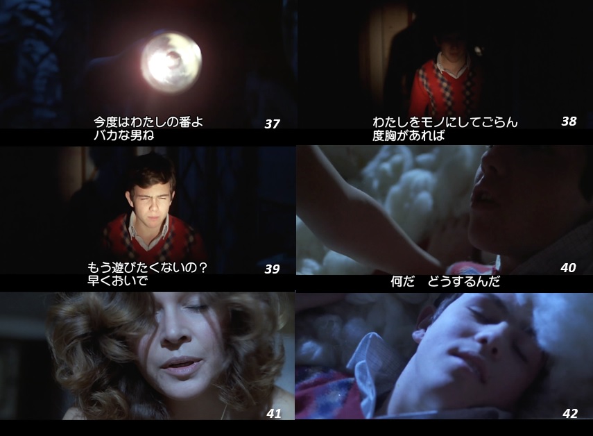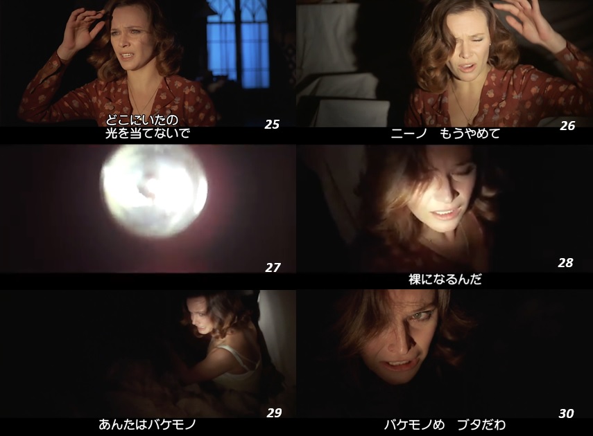 ▶ 嵐の夜に起きた停電に乗じて、懐中電灯でアンジェラを執拗に照らすニーノ。 というか、このシークエンス ( 25~36 ) では、ニーノの姿は現れずにライトとそれに照らし出され激しい呪詛の言葉を吐き続けるアンジェラの姿だけが描写される。 ニーノの姿が映されない事で 悪意の唯物的存在性 が強調されている訳です。