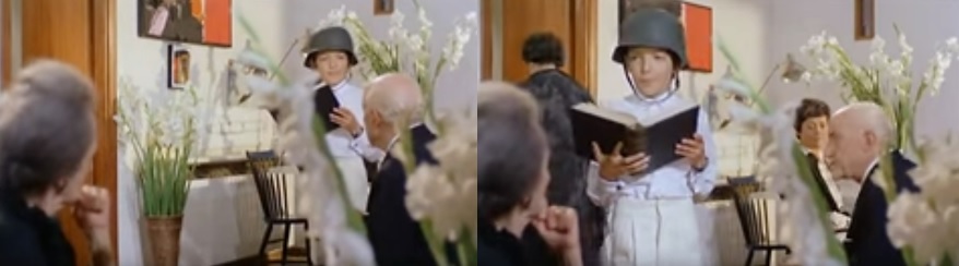 ▶ 実際、この映画の基本的設定の原型は、クレメンテッリが設立した製作会社 クレシ・チネマトグラフィカ の第1作である パスクァーレ・フェスタ・カンパニーレ 監督( 1927~1986 ) のコメディ作品 『 結婚戦争 ( l marito è mio e l'ammazzo quando mi pare ) 』 ( 1967 ) に見出すことも出来ますからね。 自分と40才以上も年の離れた老音楽家 ( ヒュー・グリフィス ) と結婚した若いアレグラ ( カトリーヌ・スパーク ) が若い男と恋に落ち、その2人があの手この手で老音楽家を殺してでも結ばれようとする話です。殺されそうな目にあいながらも、その都度、老音楽家はしぶとく生き延びるのですが、最後は死んだ振りをして二人を見逃すというのがミソです。