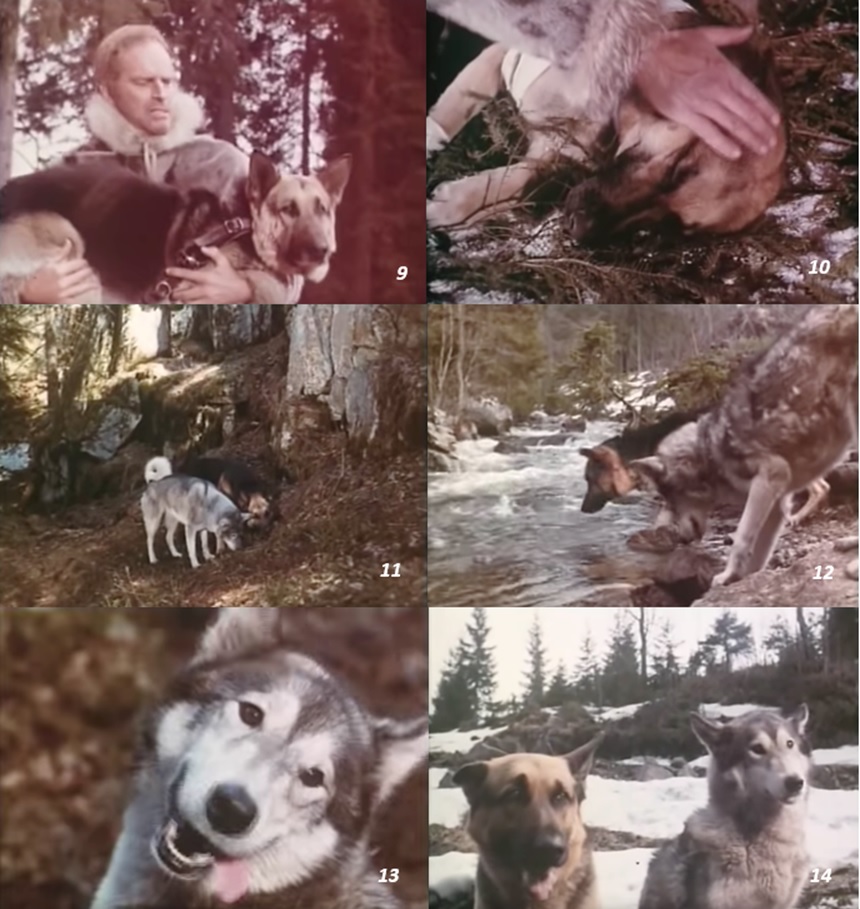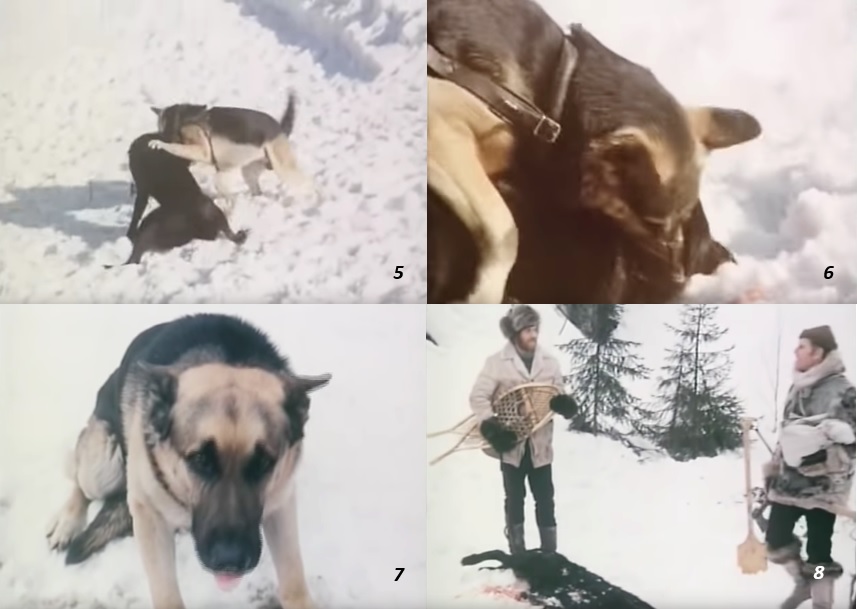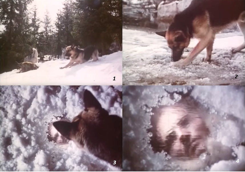 ▶ 映画の冒頭部分。 ここはバック ( 主人公の犬 ) がインディアンとの戦闘で死傷し水中に落ちたまま凍りついた主人のソーントンに会いに来た場面 ( 水中から覗くチャールトン・ヘストンの顔がちょっとした衝撃ですね )。 バックによる回想的場面となっている。野生化したバックだが、ソーントンの事を忘れられず戻るという〈 人間的なもの 〉と〈 野生的なもの 〉との振幅における情動的行動が描かれている ( 1~4 )。 この作品におけるラストの場面がこの冒頭にそのまま繋がっています。