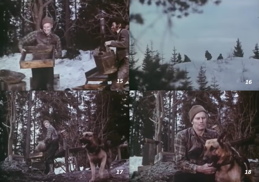 ▶ 川の傍らで金の採取に勤しむソーントン ( 15 )。 彼は元々、クロンダイク・ゴールドラッシュ ( 1896~1899 ) でカナダのユーコンに殺到した人々の為の物資を犬橇で運ぶ仕事をしていたが、途中で一念発起して金の採掘に向かうようになった。 その様子を隠れてうかがうインディアン ( 16 )。 バックは彼らに気付くが、ソーントンは気付かない ( 17~18 )。