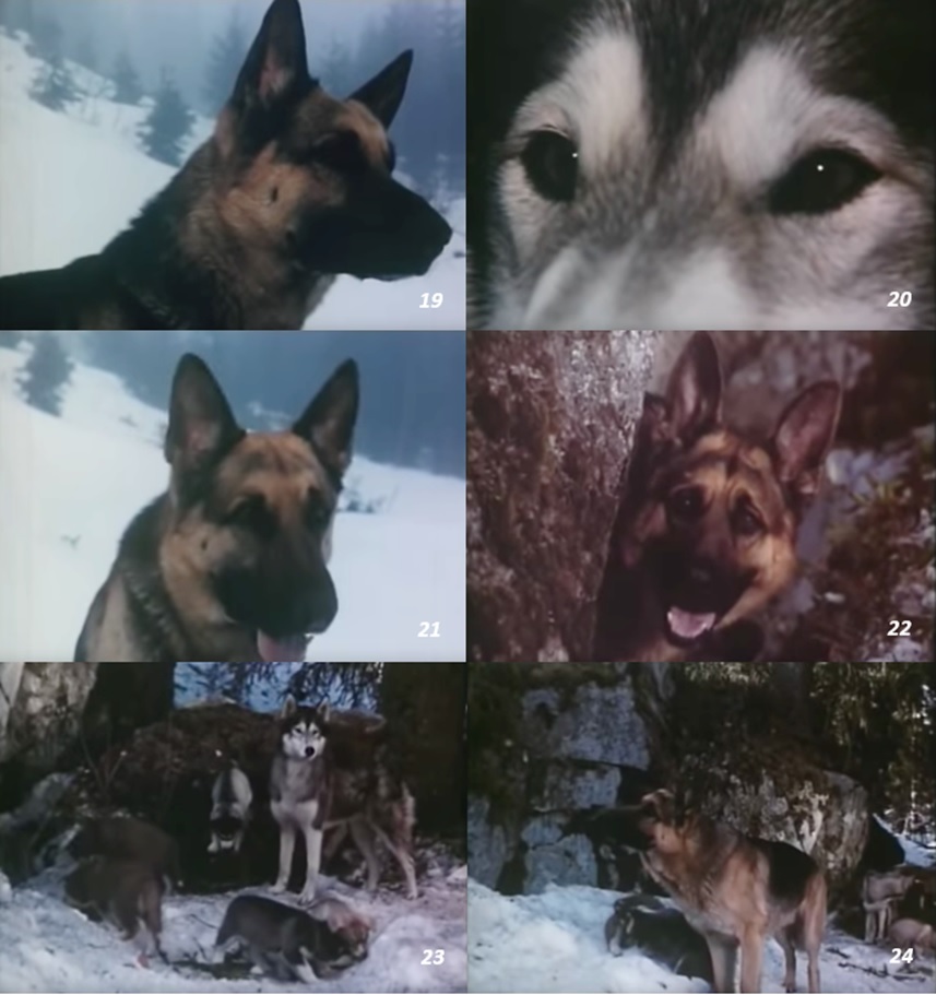 ▶ 狼と再び出会うバック。 互いに見つめ合う ( 19~21 )。ついていくと、そこには子供たちが ( 22~24 )。 狼は雌だったのであり、彼らはカップルとして描かれている。
