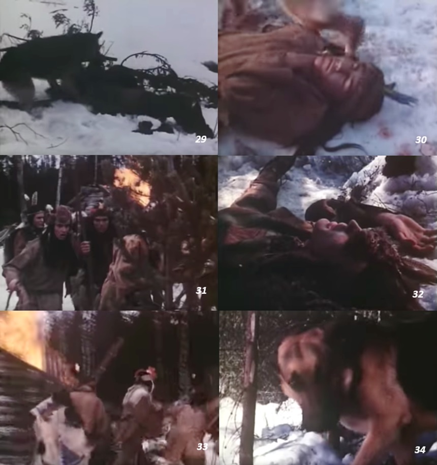 ▶ インディアンたちに対して猛烈な勢いで襲いかかり殺していくバック。 野生の血をたぎらせた凶暴性にインディアンは恐れて逃げ惑う ( 29~34 )。