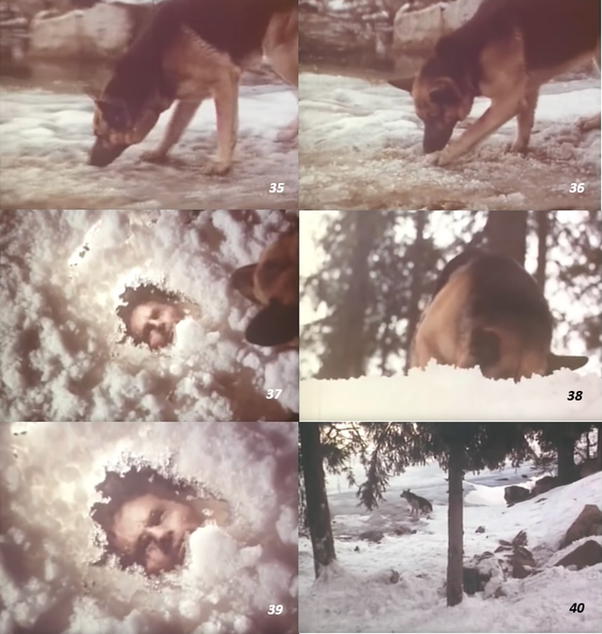 ▶ インディアンが去った後にソーントンを探すバック ( 35~36 )。 臭いの先には、逃げようとしたソーントンが、割れた雪下の水中に落ちて凍ったまま閉じこめられて死んでいた ( 37~39 )。 主人を失った事を知ったバックは野生の世界へと帰っていく ( 40 )。 このラストは冒頭の回想シーンと繋がっている訳です。