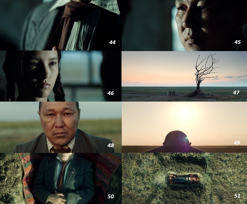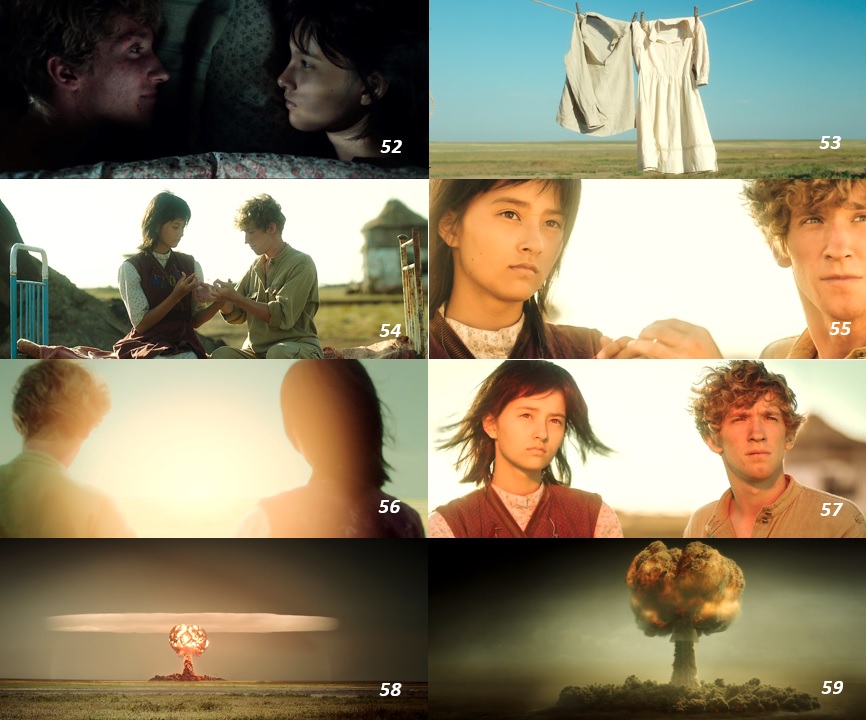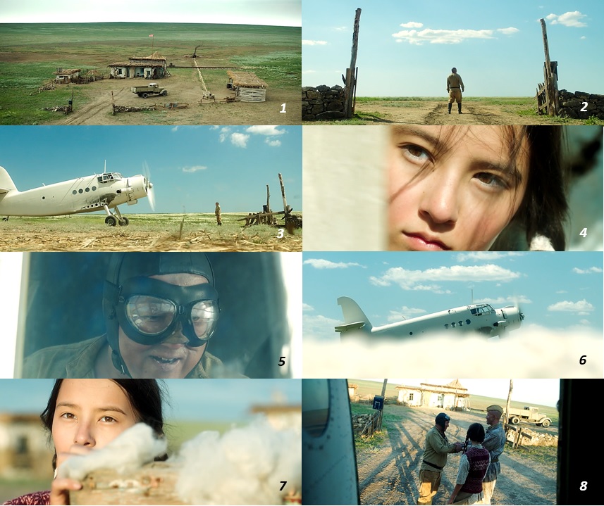 ▨ カザフスタンの草原でトルガットは娘のディナと二人で生活している ( 1 )。 見渡す限り草原が続く大地。 映画の冒頭では各爆破実験で全てが吹き飛ぶ大地の様子が描写される。 爆風の中に舞い落ちる綿。 そして場面 ( 7 ) のディナが手を置く綿からも分かるようにトルガットは綿花の栽培を始めとする農業に従事している事が分かる。 トルガットの前に着陸する飛行機 ( 2~3 )。 家の中から様子を伺うディナ ( 4 )。 その飛行機の操縦に興奮を抑えきれないトルガットは子供のように無邪気に喜んでいる ( 5~6 )。 飛行機を操縦させてくれた馴染みの軍人と握手するトルガットと傍のディナ ( 7~8 )。 トルガットは第二次世界大戦中にカザフスタンの空軍パイロットだったが、 久しぶりの運転に興奮を隠しきれなかった。 何の変哲もない日常の中の非日常。 それはトルガットに戦時中を思い起こさせるものであり、 それはおそらく彼の中で、 戦い続ける事で自分を独りの男として成長させた人生の大切な時間だったといえるものです。 しかし、 このささやかな男の誇り、 そして恋人と共に生きようとする娘のディナの人生も、核爆破と共に粉々に打ち砕かれてしまう …… 。