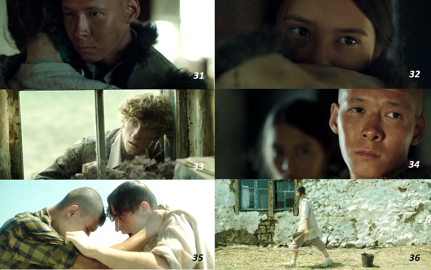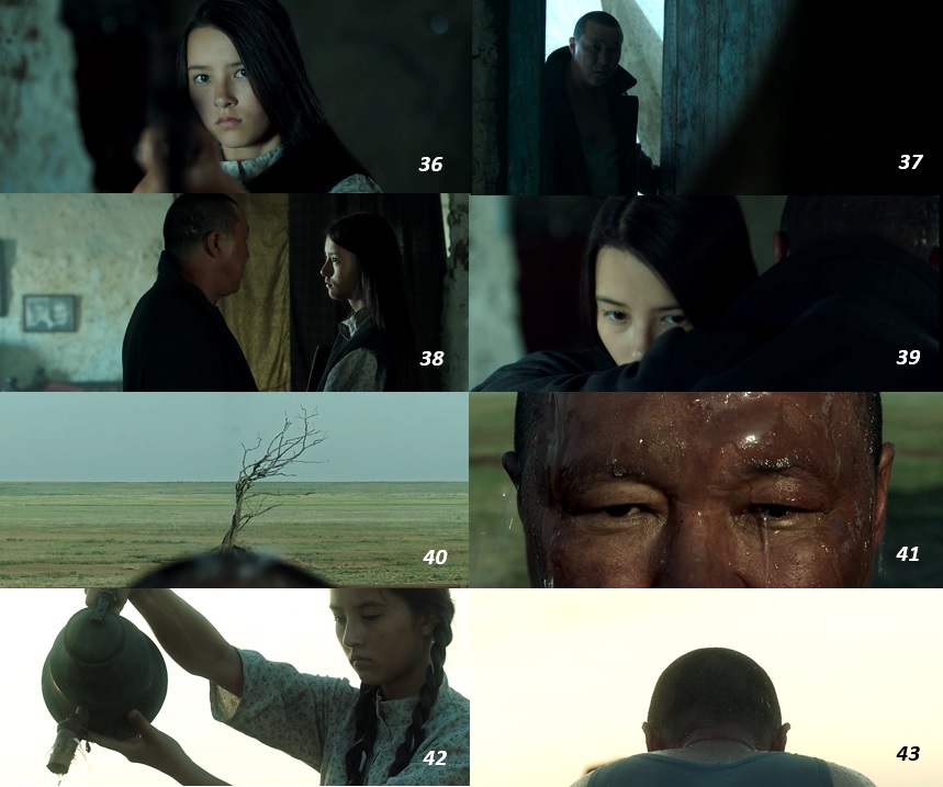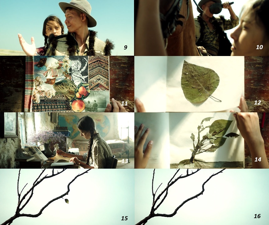 ▨ ディナには恋人カイシンがいる。 彼女と同じくカザフスタンの男性である彼は、 ディナの父親程、 家父長的人間ではない ( ディナは仕事から帰ってきた父親の靴や服を脱がして上げている ) が、 馬に乗ったままディナから水をもらい残した水を岩にかけ捨てるという場面 ( この場面は2回繰り返される ) から示されるように、 素朴ではあるものの、 ある種の男性優位を象徴する人間となっている ( 9~10 )。 その一方でディナはノートに柄物や木の葉などによるコラージュ作品をつくり、 芸術的な内面世界を垣間見させる。 ここには男性社会には従属しない彼女の主体性が秘かに表されている ( 11~14 )。 そして、 そのような日常の人間関係の終焉を予感させるかのように最後の一枚の木の葉が落ちていく ( 15~16 )。