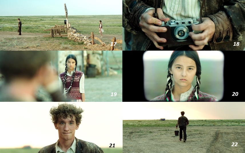 ▨ ディナの前に現れるマックス。 草原を運転中に水をもらいに来た彼との出会いはカイシンの場合とは違う "恋愛" の始まりだった ( 17 )。 カイシンとの関係が男女の主従関係に基づいているとするなら、 マックスの場合は、 対等な人間関係であり、 それは水のやりとりを始め、 カメラを撮るマックス、 そこに被写体として収まるディナ、 等の水平的構図で示されている ( 18~22 )。 マックスの西欧的容貌自体がカザフスタンの 地縁共同体 の外部性を象徴していて、 その外部からの訪問者はディナの外に飛び出したいという 脱共同体的欲望 に応えるかのようにしてディナに会いに来た といえるでしょう。