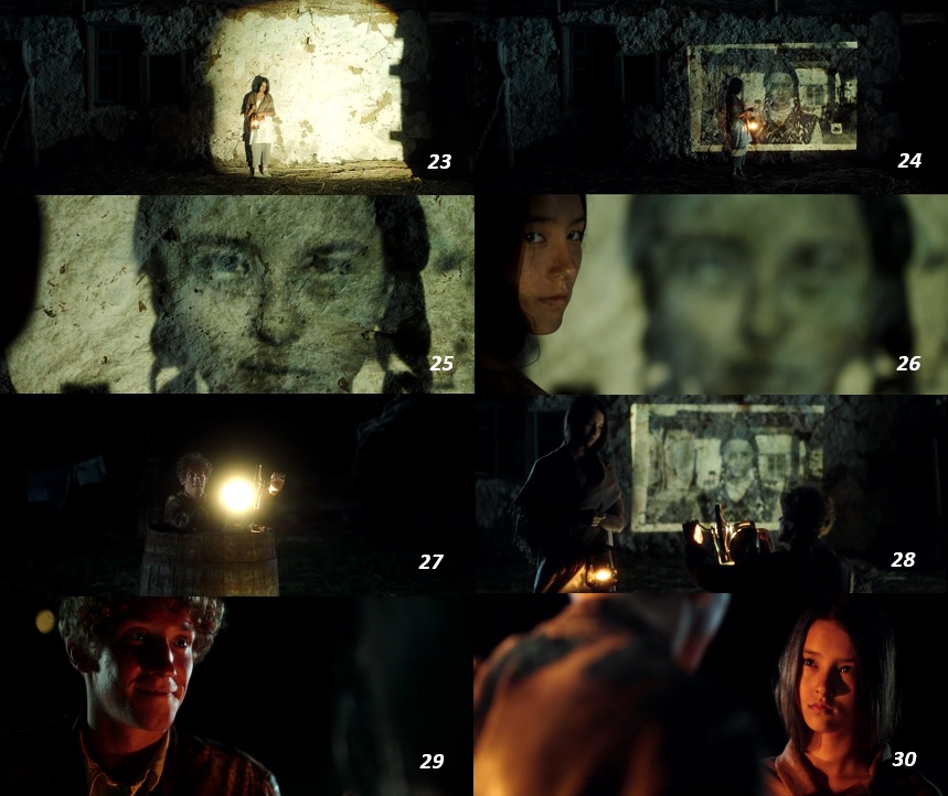 ▨ 夜中にディナに再び会いに来たマックス。 昼間に撮った写真を投影機でディナの家の壁に映しだす。 ディナの顔のクローズアップ ( *1 )。 台詞が全くないこの作品 ( *2 ) では、 マックスの投影行為が、 ディナへの告白行為の代わりになっている ( 23~28 )。 見つめ合う二人 ( 29~30 )。