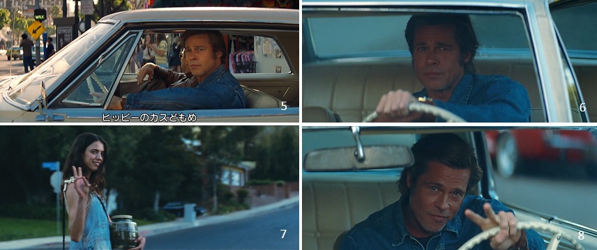 ▶ その運転中にヒッピーの女性集団を見かける。 リックは彼女らをカス扱いする ( 5 ) が、クリフは彼女らの1人のプッシー・キャットと目が合い、興味を持つ ( 6~8 )。