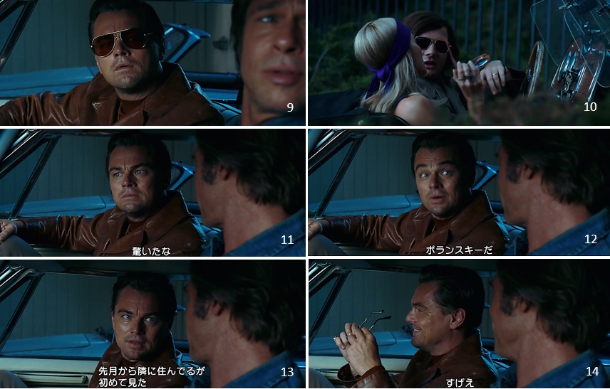 ▶ 自宅の隣人がロマン・ポランスキーである事に気付いて驚くリック ( 9~14 )。 ポランスキーは当時、『 ローズマリーの赤ちゃん ( 1968 ) 』 で既に有名でしたからね。 リックも知り合いになれるかもと秘かに期待する様子が含まれている。