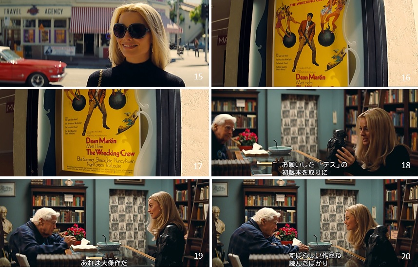 ▶ 自分が出演する 『 サイレンサー / 破壊部隊 ( 1968 ) 』を上映する映画館を見つけて上機嫌になるシャロン ( 15~17 )。 映画を観る前に、本屋で注文していた トーマス・ハーディ( 1840~1928 ) の小説『 テス ( 1891 ) 』を取りに来るシャロン ( 18~20 )。 これはポランスキーによるナスターシャ・キンスキー主演の映画『 テス ( 1979 ) 』が本来はシャロン主演だったはずのエピソードを受けてのもの。