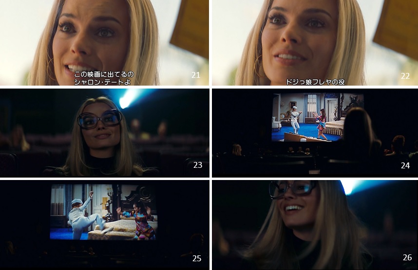▶ 作品出演者だからタダで入館させて欲しいとせがむシャロン ( 21~22 )。 もちろん、これはケチなのではなく、スター気分を味わおうとする彼女のささやかな満足感を描く演出。 映画館内で上映されている 『 サイレンサー / 破壊部隊 』 が実際のものであるのは知られた話ですね ( 23~25 )。 鑑賞中の観客の反応に喜ぶシャロンの姿 ( 26 )。