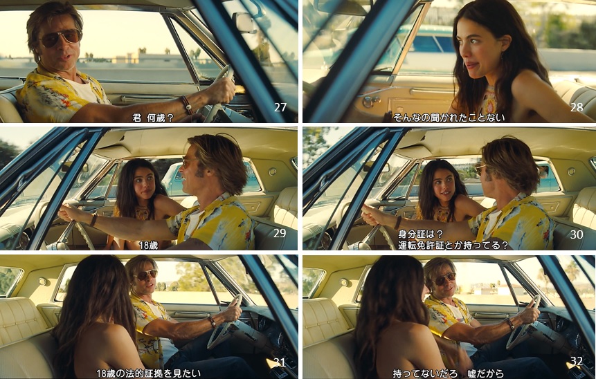 ▶ 街で偶然見かけたプッシー・キャットを彼女の属するヒッピーたちが生活するスパーン映画牧場まで車で送るクリフ。 誘惑してくるプッシー・キャットに対して年齢確認を執拗にするクリフ ( 27~32 )。 言うまでもなく、この下りはポランスキーのかつての未成年との淫行疑惑を思い起こさせるもの。