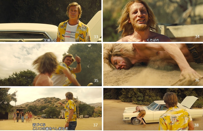 ▶ プッシー・キャットをわざわざ送り届けに来たのに、車のタイヤをパンクさせるという挑発行為をしたファミリーの男を殴り倒すクリフ ( 30~36 )。 マンソンを "教祖 / 父" として崇めるマンソン・ファミリーらの宗教的集団性をぶち壊すかのようなクリフの荒々しい振舞い ( 37~38 )。 ここからは、『 チャーリー・セズ / マンソンの女たち ( 2019 ) 』 において示されたような、象徴的父であるマンソンによって支配されていたマンソン・ファミリーを "if の世界" で打ち砕く映画界からの復讐が始まっている 。