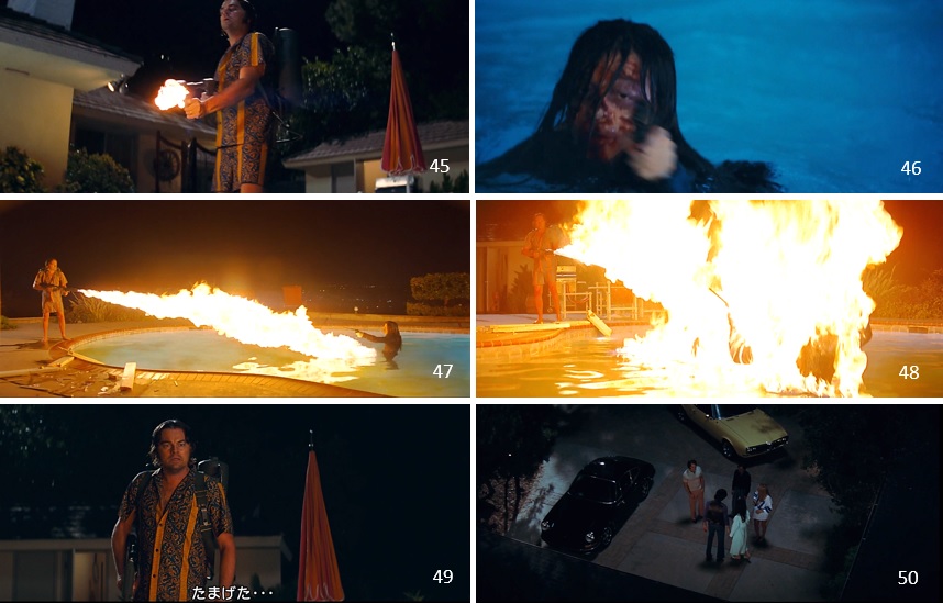 ▶ ポランスキー邸を襲うつもりだったマンソン・ファミリーだが、直前に車の音がうるさいとリックに罵られた為、矛先を彼に変えたファミリー。 部屋の中にいたクリフと鉢合せになる ( 39~40 )。 リックの愛犬ブランディが銃を構えたテックスに襲いかかり、 股間を噛んで怯ませる ( 41~43 )。弱ったテックスをぶちのめすクリフ ( 44 )。