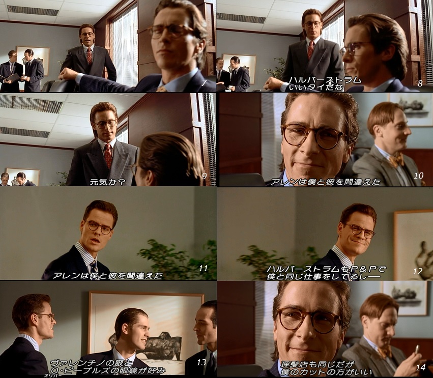 ■ Scenes 7-14 are difficult to understand because they are composed from Bateman's point of view, but if we look at 7-10, Paul Allen and Patrick Bateman are dressed the same ( glasses and haircut ), indicating that they are the same person.