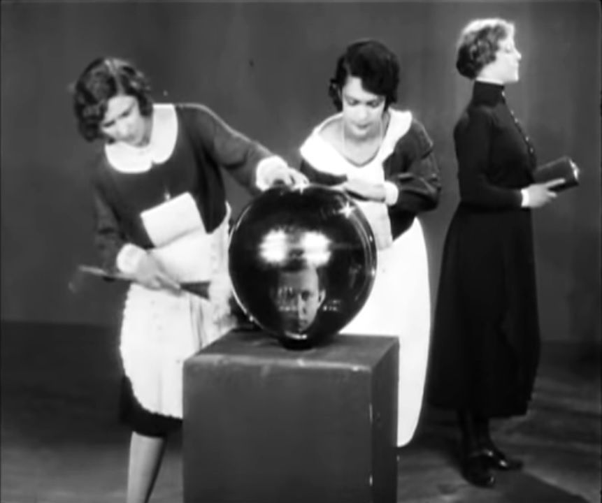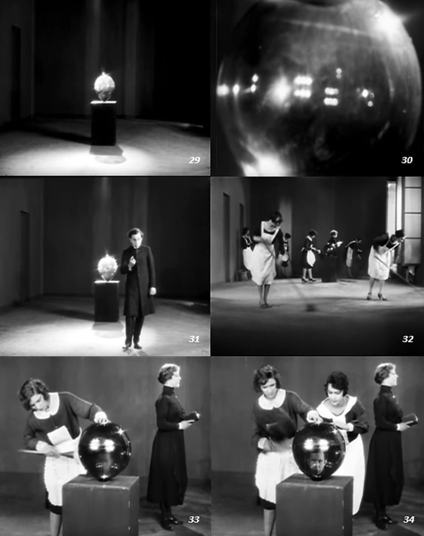 ■ A glass ball placed in a room. The pastor walks backward and approaches the glass ball while beckoning to us ( 29~31 ). The maids begin to clean the room and polish the glass ball ( 32~33 ). Inside the glass ball is "Head" of the pastor ( 34 ). Here, the glass ball has become "Symbol of the ego", another Solidified Thing, standing alongside the shell, which is "Symbol of thought".