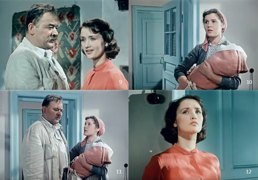 〈 f 〉 Golik drives with Katerina to Kakhovka. Golik hopes to make a career for himself by marrying Katerina, since she is the daughter of Savva, the collective farm chairman ( 5 ). However, Golik was already married to another woman and even had a child. The woman follows Golik and waves at him on the street, but Golik ignores her and passes by ( 6~7 ). Katerina accuses Golik of such behavior, but she does not know that Golik is already married ( 8 ).
