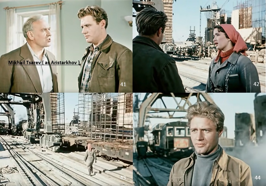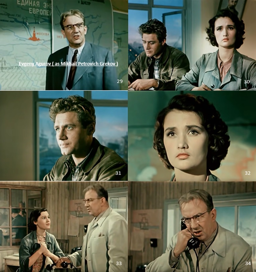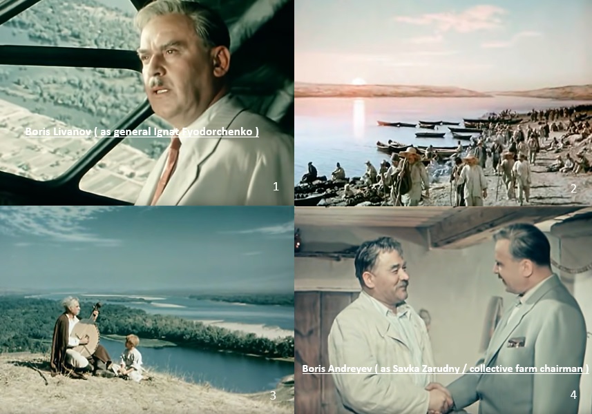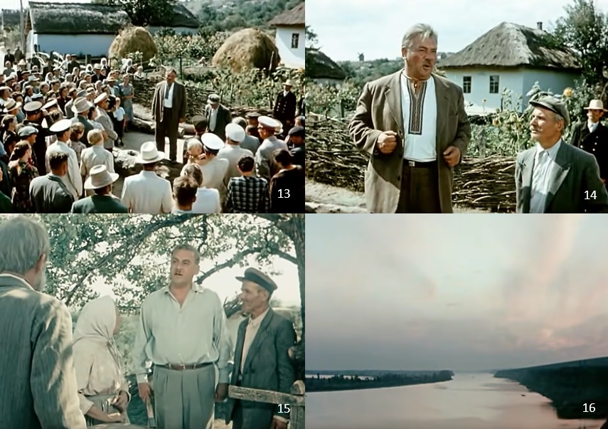 〈 e 〉 Ignat Fyodorchenko ( Boris Livanov ), a military man, looked out over the Dnipro River area from the plane on his way home and thought about the many people who live there ( 1~3 ). On returning home, Ignat meets again with Savva ( Boris Andreyev ), his childhood friend and now the collective farm chairman ( 4 ).