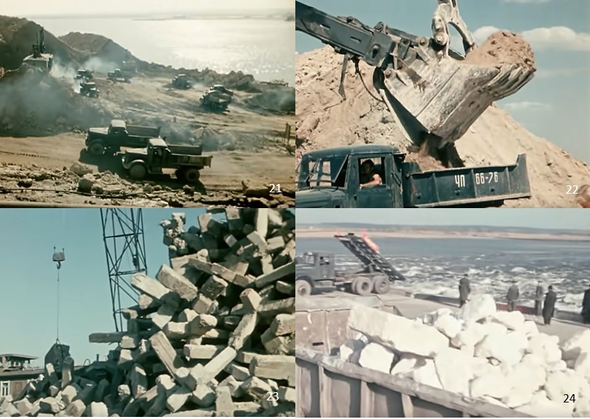 〈 j 〉 Close-up of the bulldozer removing the house in the village ( 17~18 ). Dovzhenko is very interested in bulldozers and writes in his notes that he would like to somehow take this into his poetry, but he cannot do it well himself. As if to indicate that times have changed, perhaps his interest has gone from tractor in "Earth" to bulldozer in "Poem of the Sea". In this case, the heavy machinery of tractors and bulldozers are, for Dovzhenko, the individuals that symbolize communism, and its beginning is Locomotive that the Bolsheviks ride, depicted in "Zvenigora" and "Arsenal".