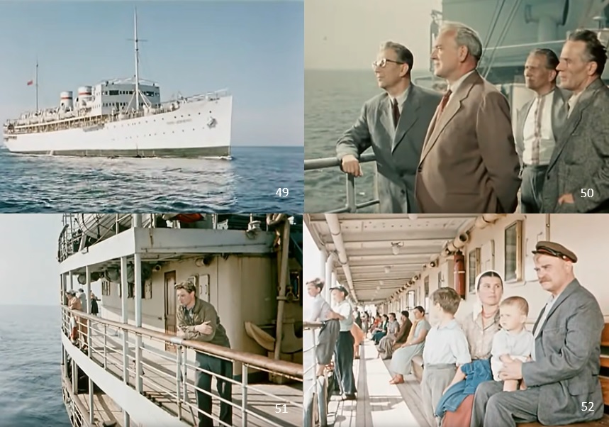 〈 i 〉 A large ship that cruises the populated seas, with GOELRO and the general public on board ( 49~50 ). Among them is Golik ( 51 ), who was supposed to be treated as an political dissenter. This last depicts the final solidary unity of the people, the thought that Dovzhenko continued to hold.